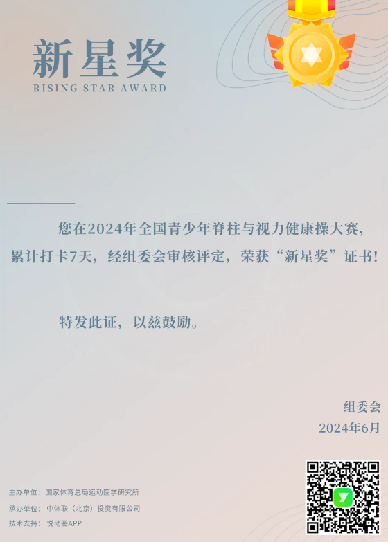 1.累计打卡7日,完成第一阶段比赛,获得由主办方单位颁发的脊柱与视力健康操“新星奖”电子荣誉证书。