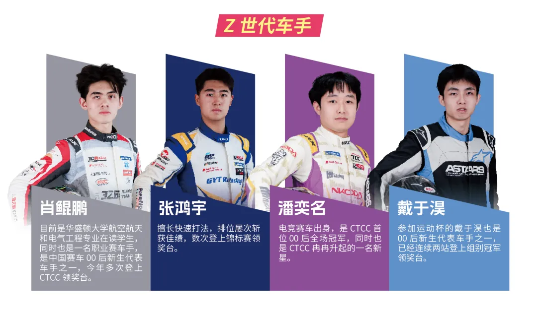 CTCC在本赛季迎来多位00后赛车的耀眼登场,有4位小将令hb火博印象深刻:生于2001年的潘奕名在上海嘉定成为CTCC首位00后全场冠军,在下半赛季更成为年度冠军的主力竞争者;生于2005年的肖鲲鹏在上赛登上俱乐部杯颁奖台;生于2006年的张鸿宇取得上海嘉定站的组别亚军;生于2000年的戴于淏携手潘奕名夺得运动杯A-1组年度冠军。